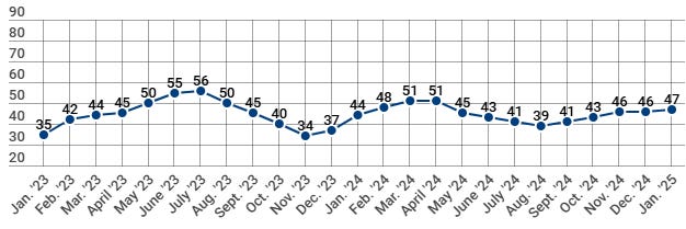 The NAHB/Wells Fargo Housing Market Index (HMI) measures conditions in the single-family housing market. The index rose one point in January from 46 to 47. HMI Index readings above 50 are indicative of favorable single-family home builder sentiment. The current sales conditions index increased three points to 51, the measure of sales expectations over the next six months fell six points to 60, and the prospective buyer traffic index rose two points to 33. The NAHB Chief Economist noted “NAHB is forecasting a slight gain for single-family housing starts in 2025, as the market faces offsetting upside and downside risks from an improving regulatory outlook and ongoing elevated interest rates”. Regionally, the Northeast was the strongest with a rise of five points to 60. The Midwest rose one point to 47, and the South rose one point to 46. The West remained the weakest falling one point to 40.