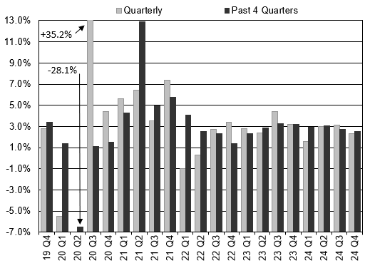 Real gross domestic product (GDP) grew at a 2.3% annual rate in the fourth quarter of 2024, following a 3.1% pace of growth in the third quarter, according to the latest Bureau of Economic Analysis report. For calendar year 2024, real GDP increased at an average rate of 2.5%, slightly above our 2% trend growth estimate.