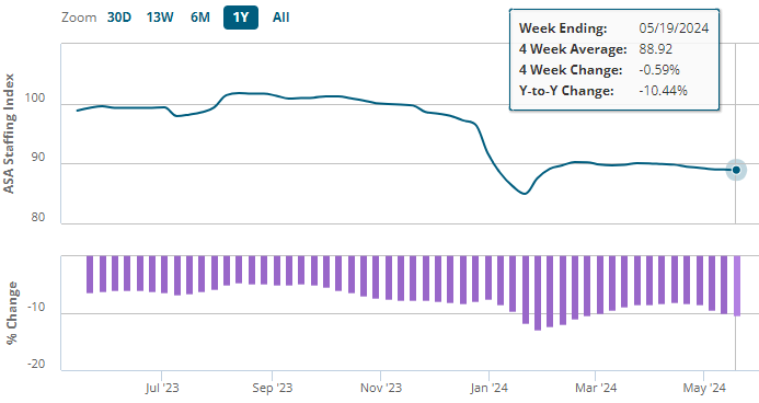 The American Staffing Association (ASA) Staffing Index shows that staffing trends are holding steady, although levels remain 10.4% lower year-over-year. We follow temporary staffing levels because short-term staffing changes typically occur before changes in full-time staffing. So far this cycle, temporary staffing has shown more weakness than unemployment insurance claims, nonfarm payrolls, and unemployment. There is little doubt that tighter monetary policy is bringing the labor market into balance.