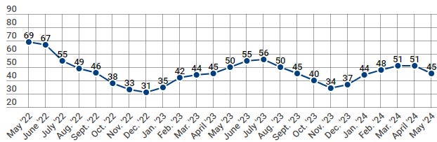 The NAHB/Wells Fargo Housing Market Index (HMI) fell six points to 45 in May, declining for the first time since November 2023. Readings above 50 indicate favorable single-family home builder sentiment. Rising mortgage rates caused a slowdown in homebuyer activity.
