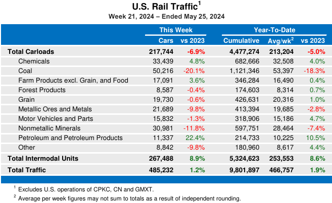 The Association of American Railroads (AAR) reported US railroads saw total combined rail traffic increase 1.9% through the first 21 weeks of 2024 compared to last year. The combined rail traffic figure includes cumulative carload volume down 5.0% and intermodal units up 8.6%. The drop in carload volume is attributed to the large decline in coal volume, which is down 18.3% compared to last year. In the most recent week of reporting, just three of ten carload commodity groups posted an increase compared to the same week last year. Excluding coal, rail traffic looks healthy.