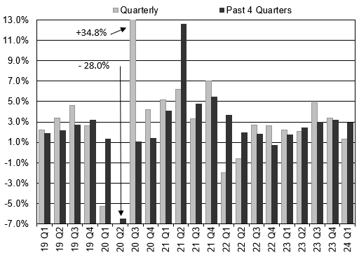 Real gross domestic product (GDP) increased at a 1.3% annualized rate during the first quarter of 2024. Personal consumption expenditures are the most significant GDP component, representing almost 70% of overall GDP. This component increased at a 2.0% annual rate in the first quarter, down from 3.3% in the prior quarter.