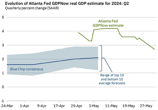 The latest Atlanta Fed GDPNow estimate is for second-quarter GDP growth of 2.7%, and the New York Fed Staff Nowcast forecasts 1.8% GDP growth. We expect the pace of real GDP growth in calendar year 2024 to be near our long-term 2.0% trend growth rate. Large-scale investments in artificial intelligence may lead to a productivity boost and stronger GDP figures. U.S. population growth remains near historic lows, increasing just 0.5% in 2023.
