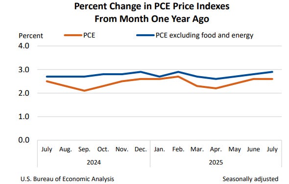 As shown in the chart below, the headline and core PCE rates have been trending sideways for over a year. The most recent three-month annualized headline PCE inflation rate is 2.6%, and the three-month annualized core-PCE rate is 3.0%. The upcoming September FOMC meeting may be one of the rare occasions when the FOMC lowers the fed funds rate, despite three, six, and twelve month core inflation running above the Fed’s 2% target. We anticipate that the weakening labor market will be used as justification for a rate cut in September.