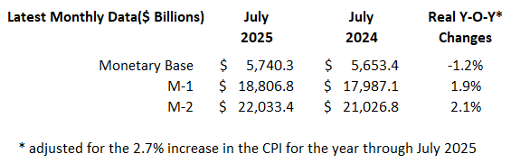 The next Federal Open Market Committee (FOMC) Meeting is scheduled for September 16th and 17th. A 25 basis point rate cut at the September FOMC is likely. The meeting will include an updated Summary of Economic Projections (SEP) from FOMC members. Here is a link to their most recent June 2025 projections. The SEP’s year-end 2025 federal funds rate projection is within the 3.9% to 4.4% range.