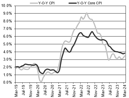 Today’s March CPI inflation report shows that the pace of core inflation has stabilized around 3.8% year over year. The core CPI inflation rate peaked at 6.6% year over year in September 2022 and decelerated to 3.75% last month. The previous three year-over-year CPI figures have been 3.86% in January, 3.75% in February, and 3.80% in March. We believe the Fed is unlikely to lower the federal funds rate with the core CPI inflation rate well above 3%.